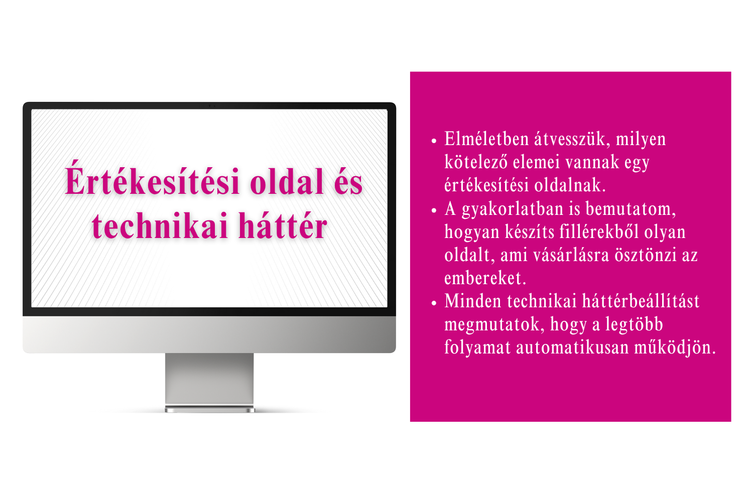 Megtanulod, hogyan állítsd be a szükséges technikai alapokat – informatikai tudás nélkül –, hogy az eladások automatikusan történjenek, akkor is, amikor nem dolgozol.